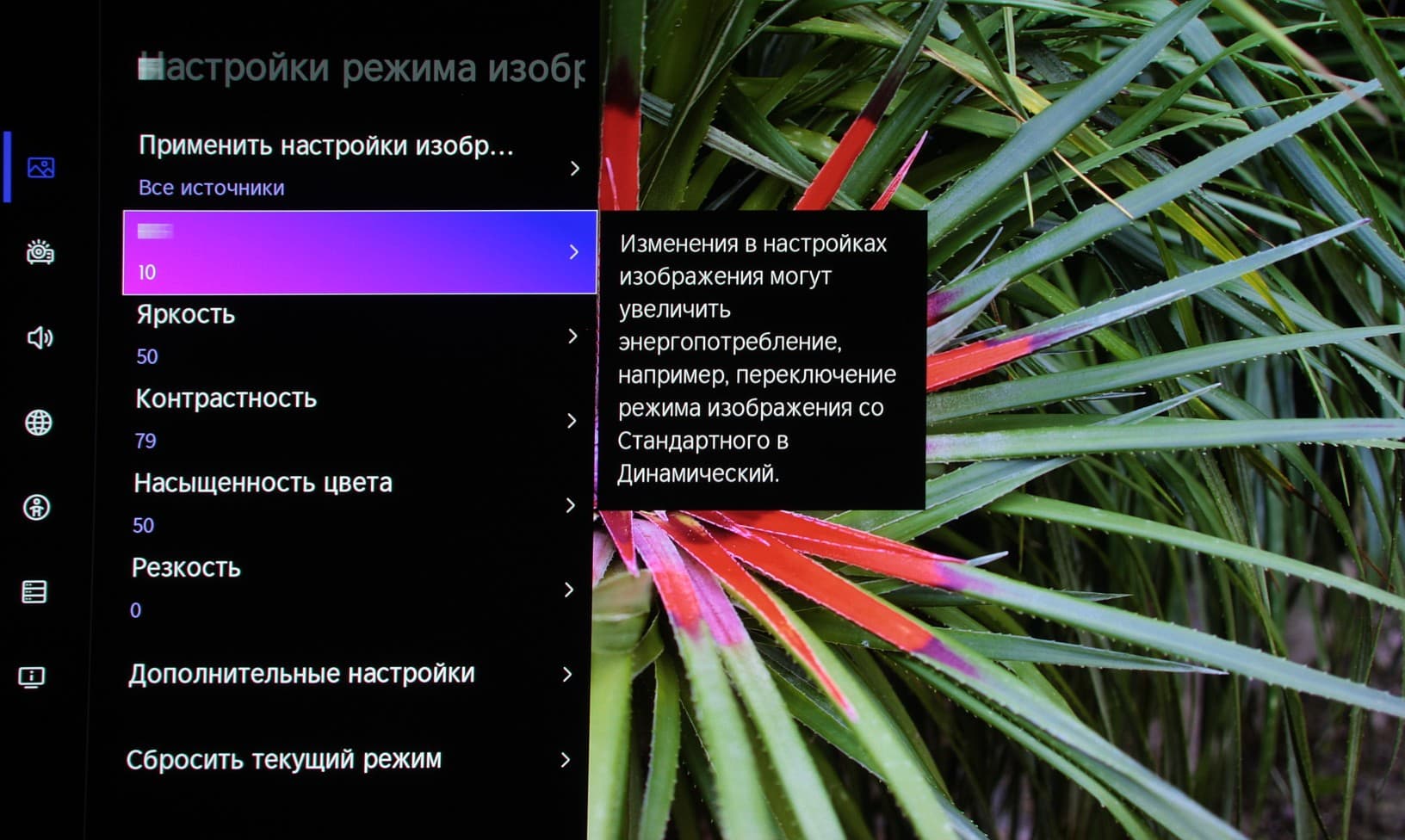 Есть русифицированный вариант интерфейса. Качество перевода хорошее. Непосредственно при регулировке параметров изображения на экран выводится уже только название настройки, ползунок и текущее значение или список вариантов, что облегчает оценку влияния этой настройки на изображение, при этом настройки с ползунками перебираются стрелками вверх и вниз.