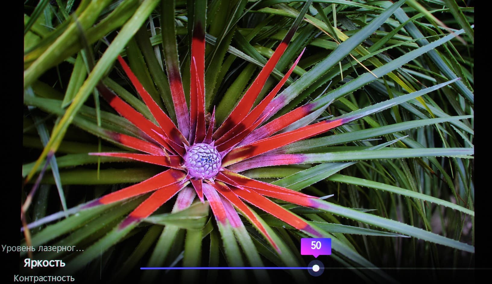 Проекция с большими отклонениями падения света от перпендикуляра к экрану делает невозможным точное измерение яркостных параметров по методике ANSI подробно описанной тут. Максимальная яркость (при приемлемой цветопередаче — режим Динамический) белого поля на экране размером 151 на 85 см оказалась порядка 400 кд/м². И даже в режиме Filmmaker яркость составляет 300 кд/м². Такого светового потока более чем достаточно для комфортного просмотра в затемненном помещении на экране с диагональю до 160 дюймов. Напомним, что для затемненного помещении целевая яркость составляет 55 кд/м². Снижая мощность источника света, яркость можно понизить примерно в 2,8 раза. Также мы измерили контрастность, измеряя освещенность в центре экрана для белого и черного поля, т. н. контрастность full on/full off. Она достигла значения 3000:1. Это высокое значение. В целом по яркостным характеристикам и с учетом позиционирования (просмотр дома на экране до 150 дюймов по диагонали) к этому проектору нет никаких замечаний. Все отлично.