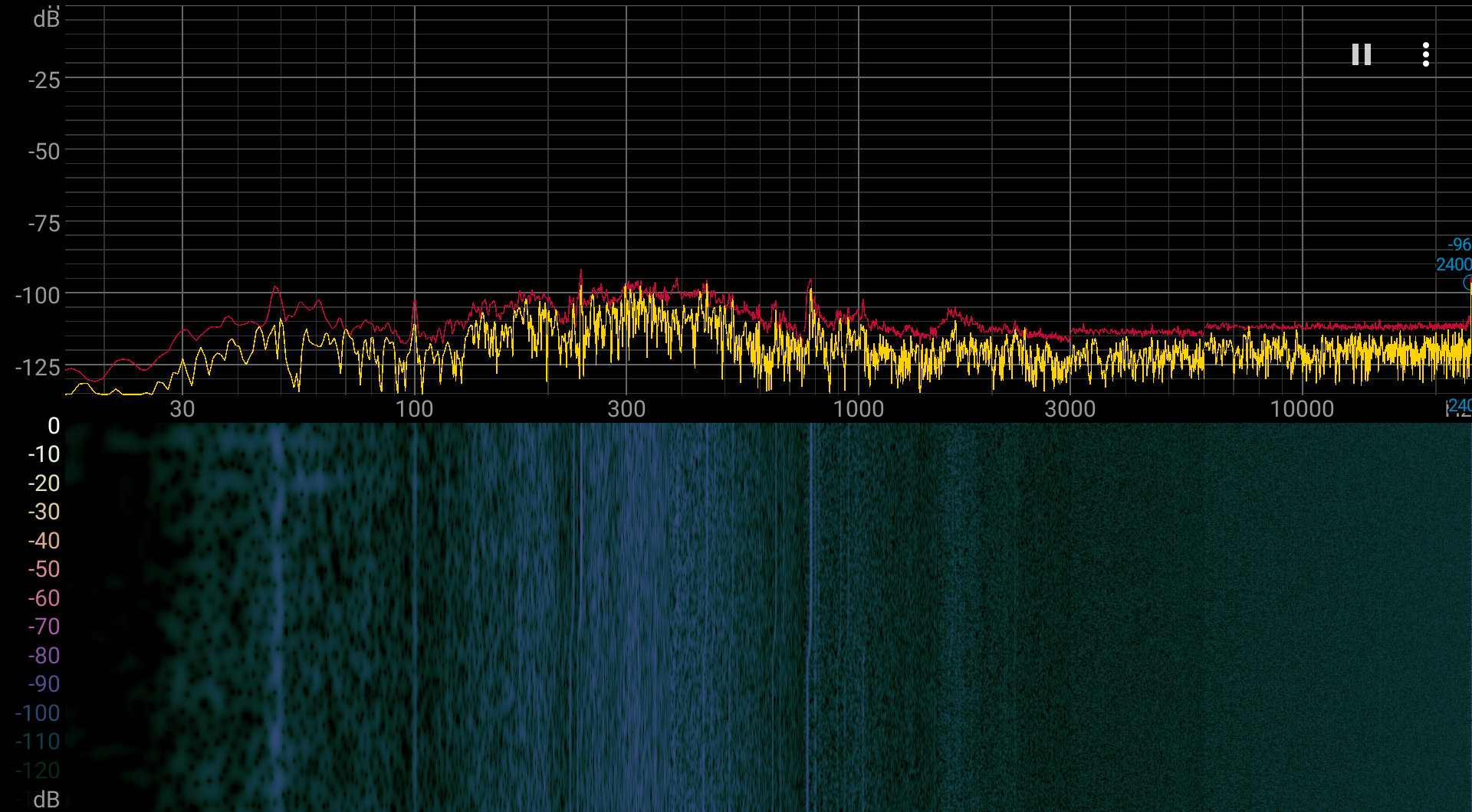 Спектрограмма шума от системы охлаждения не идеально ровная, есть несколько неинтенсивных пиков, но в целом характер звука дискомфорта не доставляет.