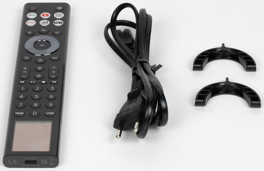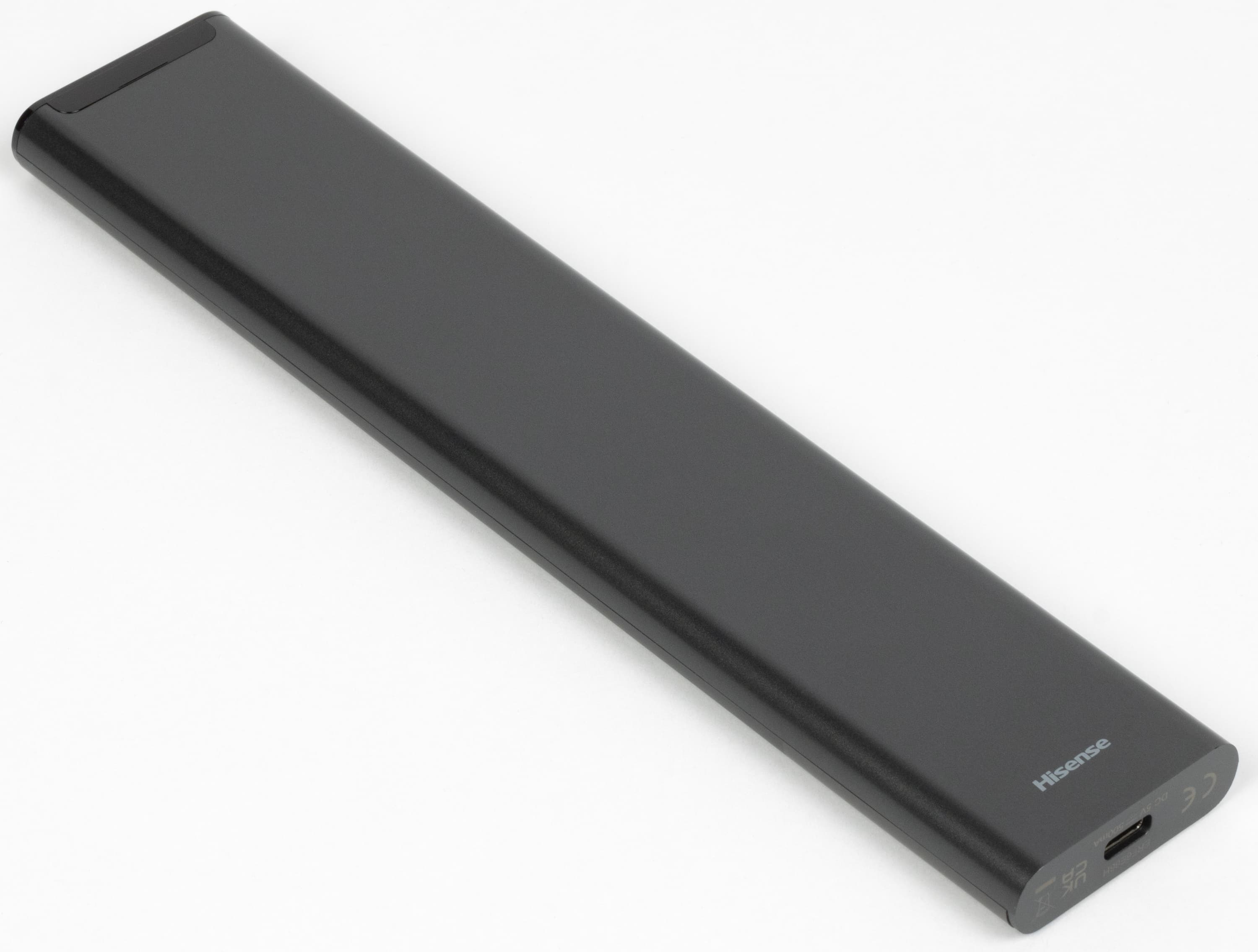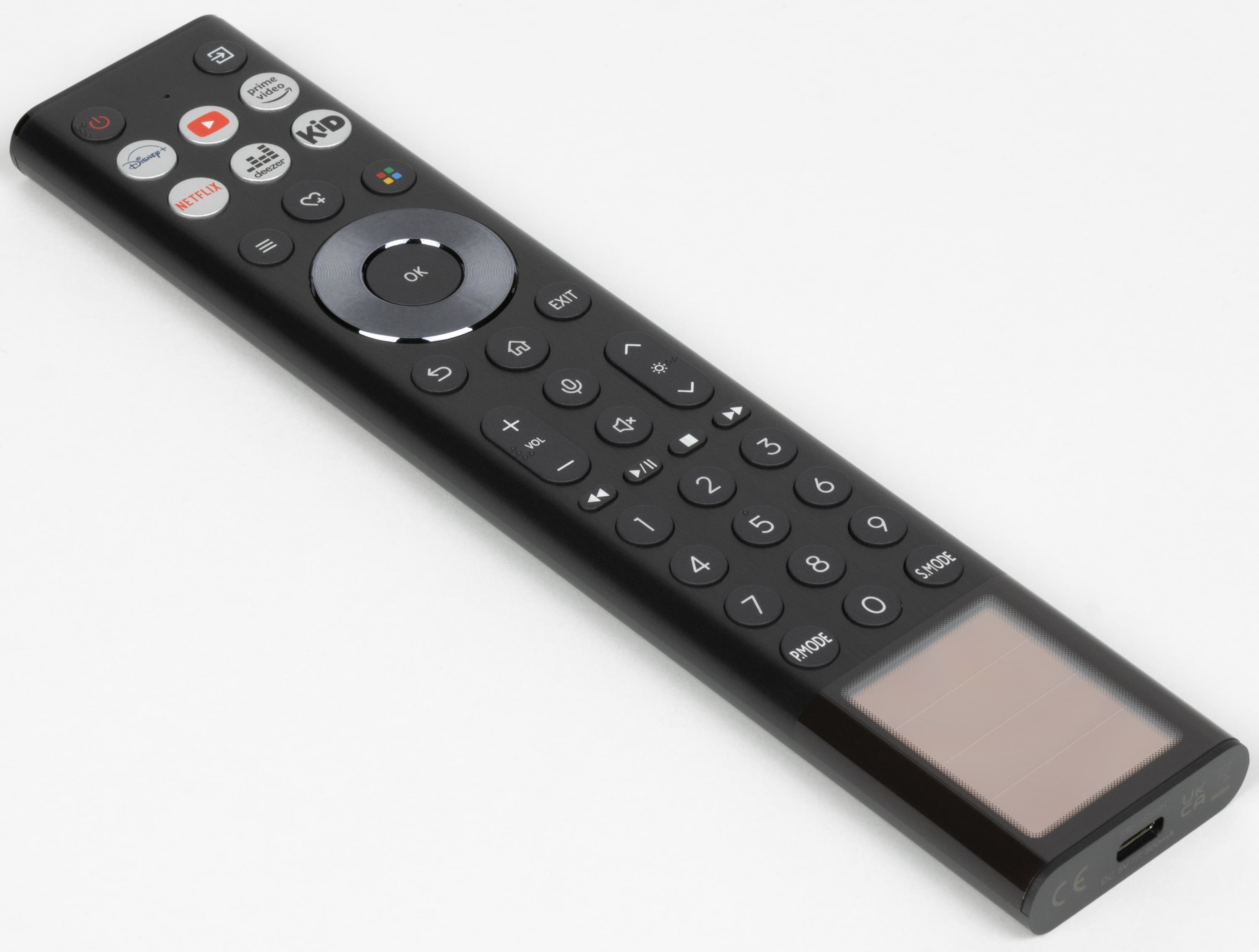 Корпус пульта изготовлен из пластика. Обозначения кнопок достаточно крупные и контрастные. Самих кнопок много, пожалуй, даже слишком много, но, как показывает практика, пользоваться такими пультами все равно удобнее, чем лаконичными, с парой-другой кнопок. Отметим шесть выделенных кнопок для запуска приложений, притом неактуальных для пользователей в России. Приятно, что есть кнопка Избранное, на которую можно назначить переключение на выбранный вход HDMI или запуск выбранного приложения. В задней части пульта есть солнечная батарея для зарядки встроенного аккумулятора. Также пульт можно зарядить, подключив зарядку к разъему USB-C в торце пульта.