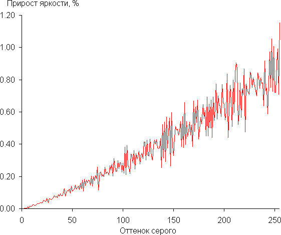 Для оценки характера роста яркости на шкале серого мы измерили яркость 256 оттенков серого (от 0, 0, 0 до 255, 255, 255) для случая, когда параметр Настройка гаммы = 2.2. График ниже показывает прирост (не абсолютное значение!) яркости между соседними полутонами: