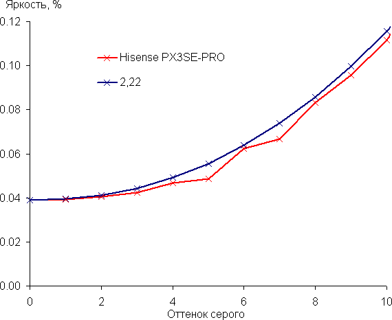 Аппроксимация полученной гамма-кривой дала значение показателя 2,22, что близко к стандартному значению 2,2, а реальная гамма-кривая мало отклоняется от аппроксимирующей функции: