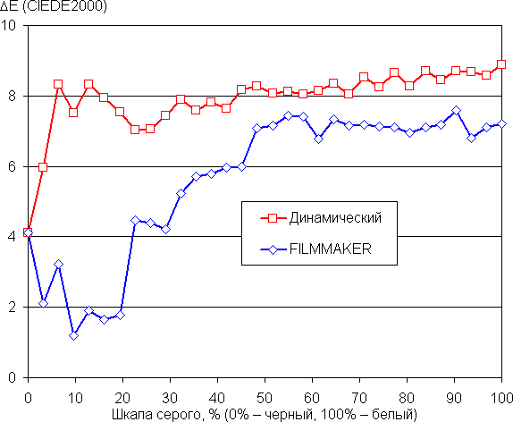 Графики ниже показывают цветовую температуру на различных участках шкалы серого и отклонение от спектра абсолютно черного тела (параметр ΔE) для двух режимов — Динамический (самый яркий, но с приемлемой цветопередачей) и Filmmaker (с приоритетом качества цветопередачи):