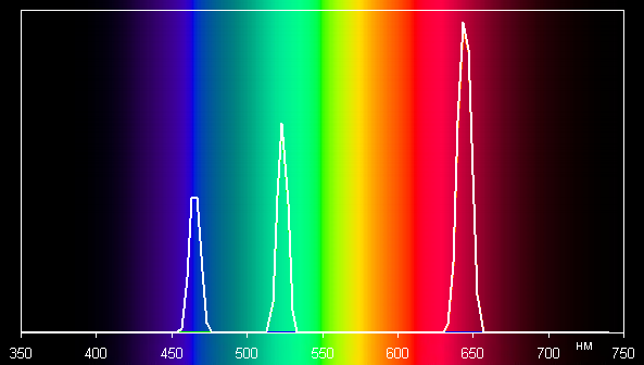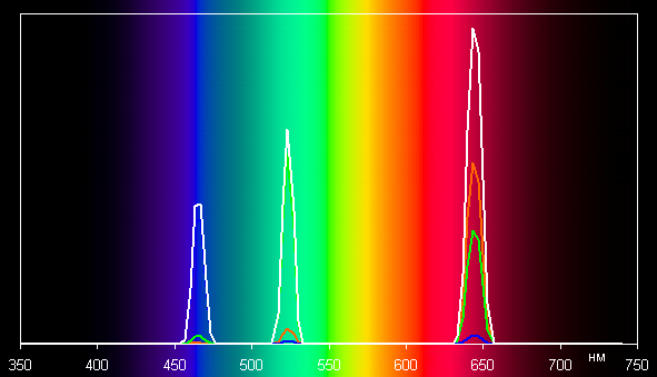 Видно, что цвета очень хорошо разделены, и перекрестное подмешивание цветов минимальное. Узкие пики подтверждают сведения о лазерных источниках света.