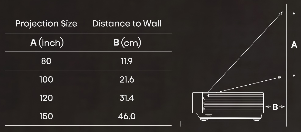 Проектор ультракороткофокусный, к тому же объектив смещен назад, поэтому при размещении проектора очень близко к экрану можно получить изображение большого размера.