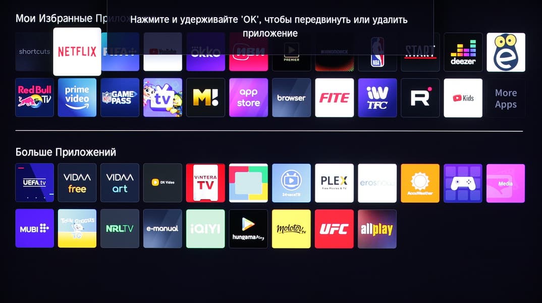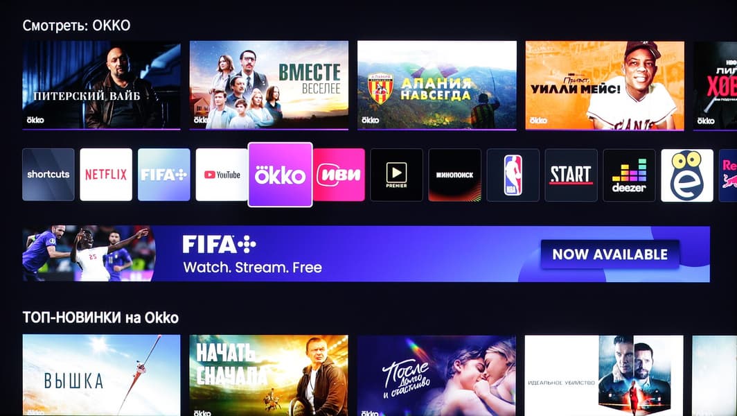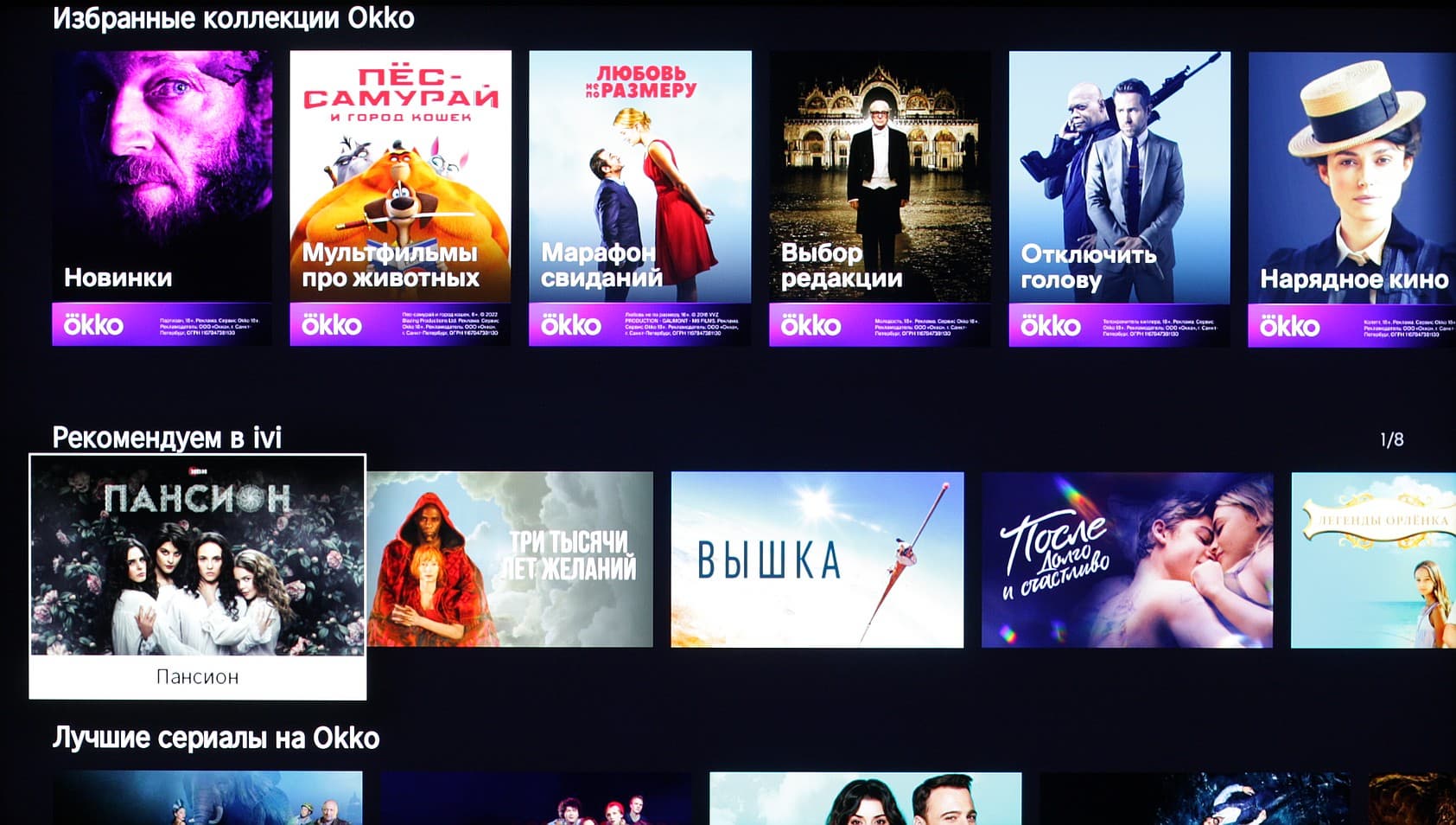 Ниже за лентой избранных приложений идут ленты рекомендованного контента из Okko, ivi и т. д.