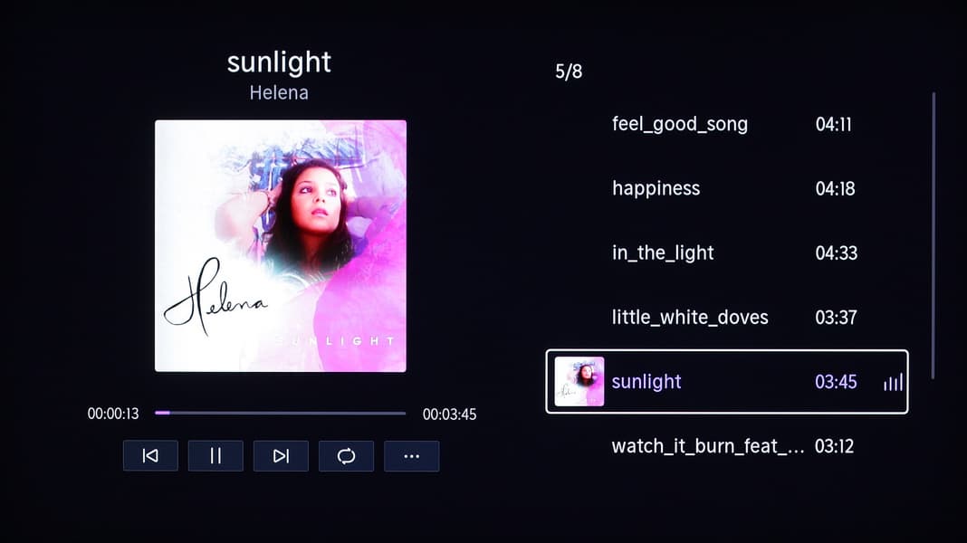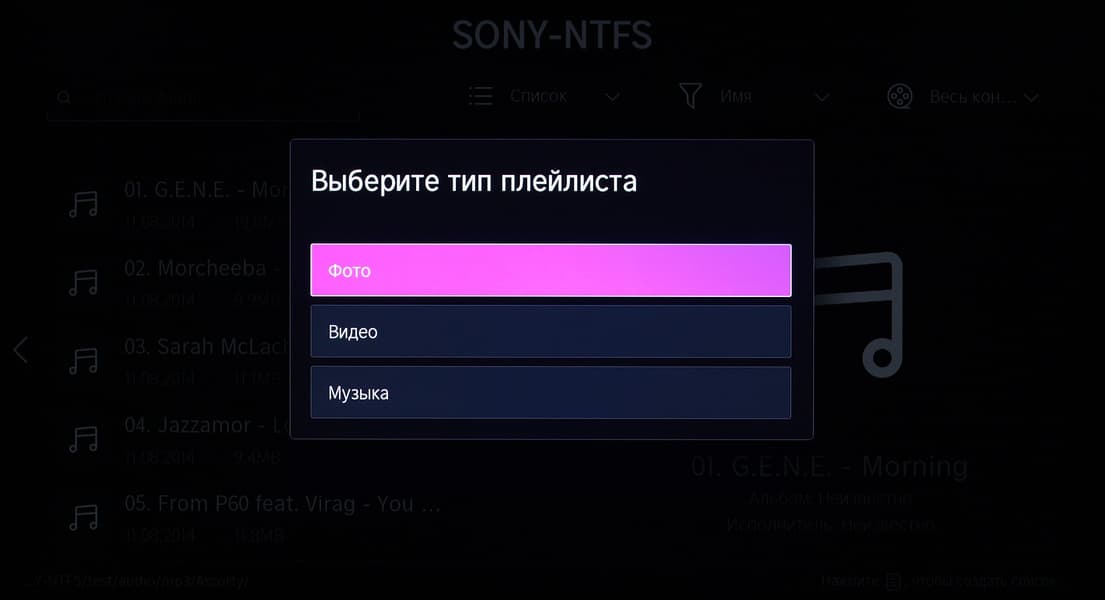 Были опробованы жесткие диски, внешние SSD и обычные флешки. Два протестированных жестких диска работали от любого из двух USB-портов, а после некоторого периода отсутствия обращения к ним жесткие диски отключались. Отметим, что телевизор поддерживает USB-накопители с файловыми системами FAT32 и NTFS (exFAT не поддерживается), а с кириллическими названиями файлов и папок не было никаких проблем. Плеер телевизора обнаруживает все файлы в папках, даже если на диске очень много файлов (более 100 тысяч), что получается далеко не у каждого «умного» ТВ. Можно создать раздельные списки воспроизведения с картинками, видео или музыкой, при этом их можно затем просто воспроизвести, а список с музыкой потом еще и использовать при просмотре слайд-шоу.