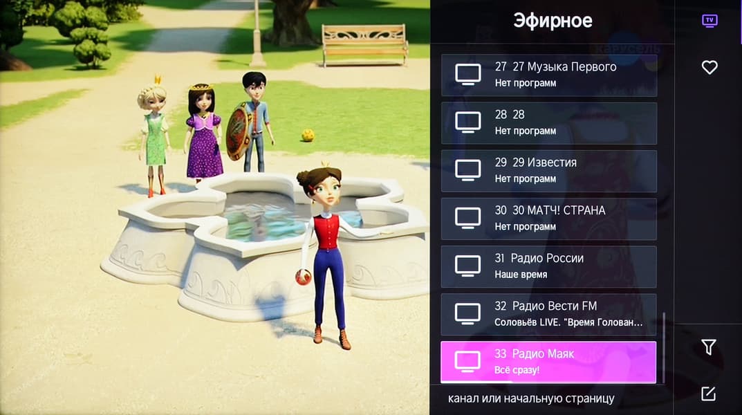 В ряде программ работает голосовой ввод текста. Также есть базовая интеграция с самим ТВ, например, голосом можно менять громкость, выключать/включать звук и выключать сам ТВ, открывать меню с настройками, выбирать нужный вход и запускать программу по ее названию (хотя бы попытаться, YouTube точно запускается). Еще можно вывести на экран программу телепередач и переключиться на ТВ-канал по его номеру.