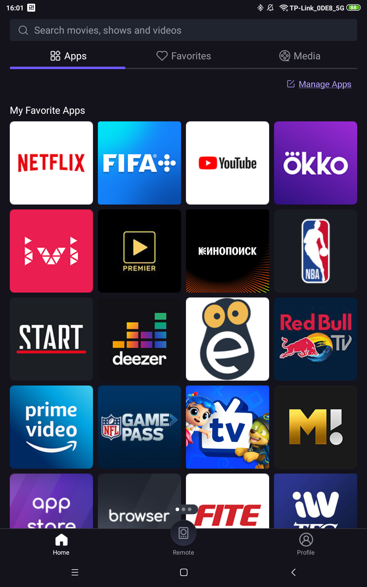 В этом приложении есть виртуальный пульт ДУ с возможностью удобного ввода цифр и просто любого текста, с координатной панелью ввода, с «цветными» кнопками. В приложении удобно оперировать с установленными на ТВ приложениями, также можно запустить на воспроизведение на ТВ мультимедийные файлы, находящиеся на мобильном устройстве, а микрофон мобильного устройства можно использовать для работы с голосовым помощником телевизора. Из приложения можно включить телевизор, находящийся в режиме неглубокого сна.