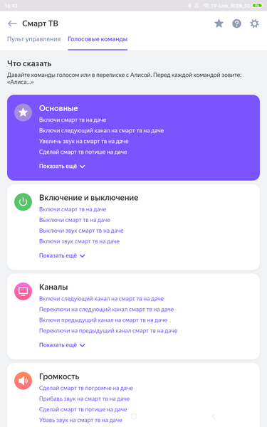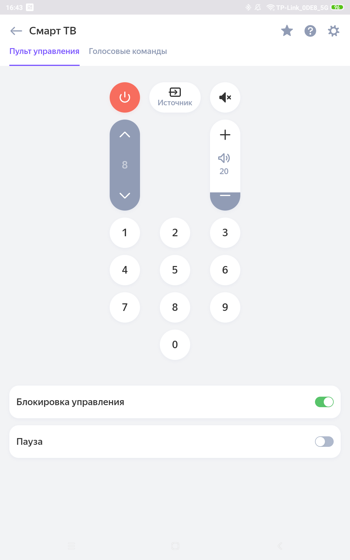 Управление может происходить с помощью виртуального пульта с очень ограниченной функциональностью, также с помощью голосовых команд, отдаваемых Алисе. Хотя включить ТВ с помощью Алисы все же не получается.