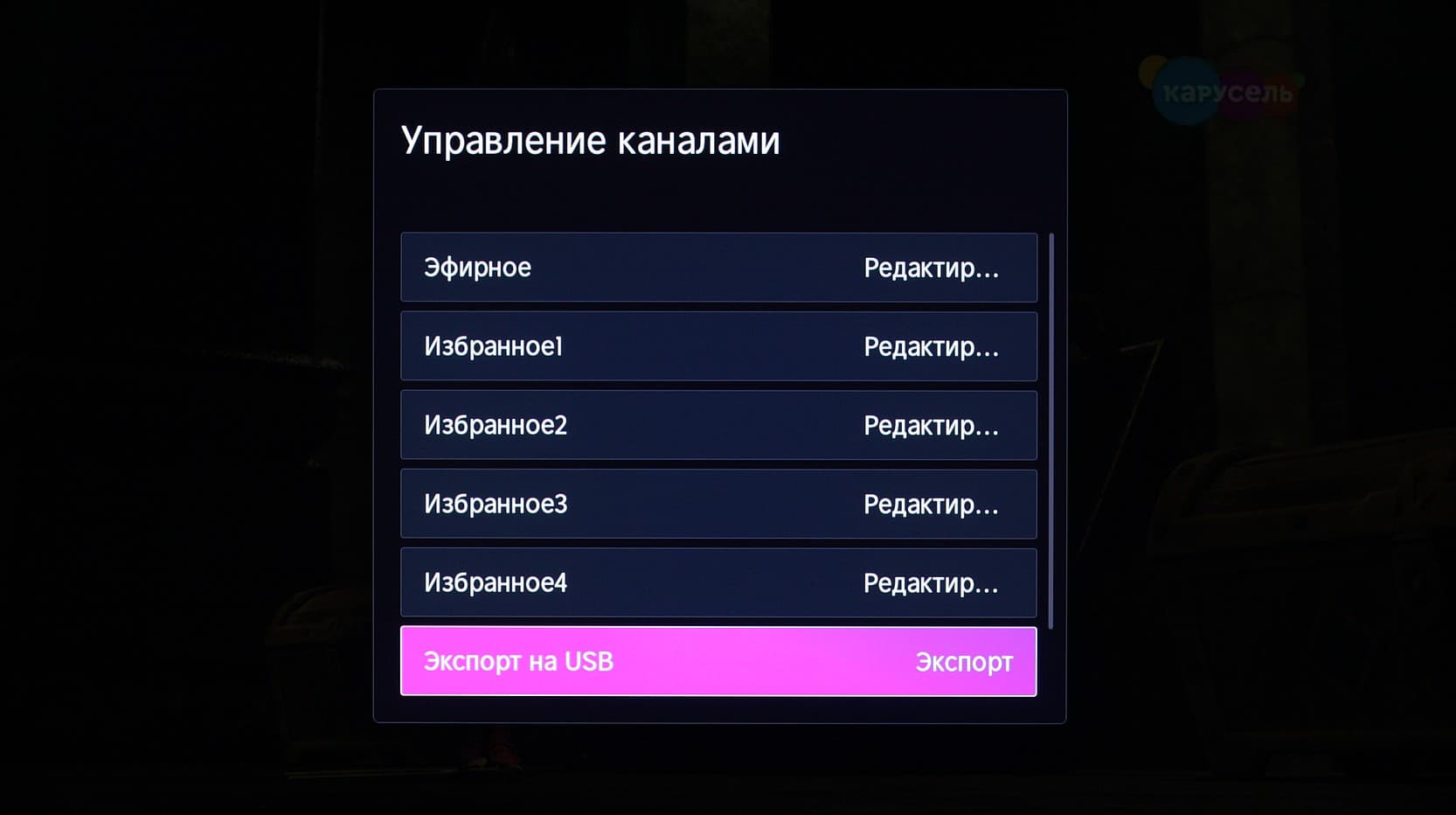 Есть четыре списка любимых программ. Список каналов можно записать на USB-носитель и наоборот, загрузить с него.