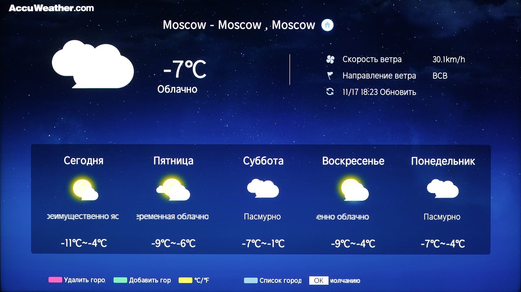 На максимальной яркости изображение не будет казаться блеклым даже в ярко освещенном помещении. Тогда как в полной темноте минимальная яркость может показаться излишне высокой. Впрочем, большая площадь экрана подразумевает большой угол обзора, также сам ТВ уже выступает в качестве источника света, поэтому даже при выключенном свете вряд ли пользователь будет чувствовать дискомфорт.