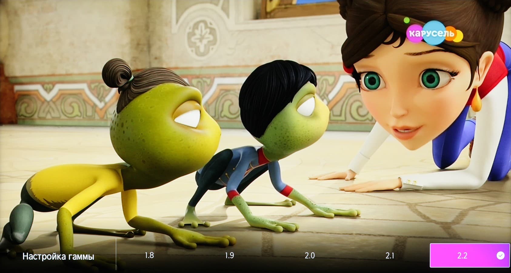 Тестовые ролики на определение равномерности чередования кадров помогли выявить, что телевизор при воспроизведении видеофайлов подстраивает частоту обновления экрана под частоту кадров в видеофайле, но только на 50 или 60 Гц, поэтому файлы с 24 кадр/с воспроизводятся с чередованием длительности кадров 2:3. Впрочем, в настройках для параметра Сверхплавное движение можно выбрать вариант Кино, тогда кадры файлов с 24 кадр/с будут выводится с одинаковой длительностью (и без вставки промежуточных кадров).