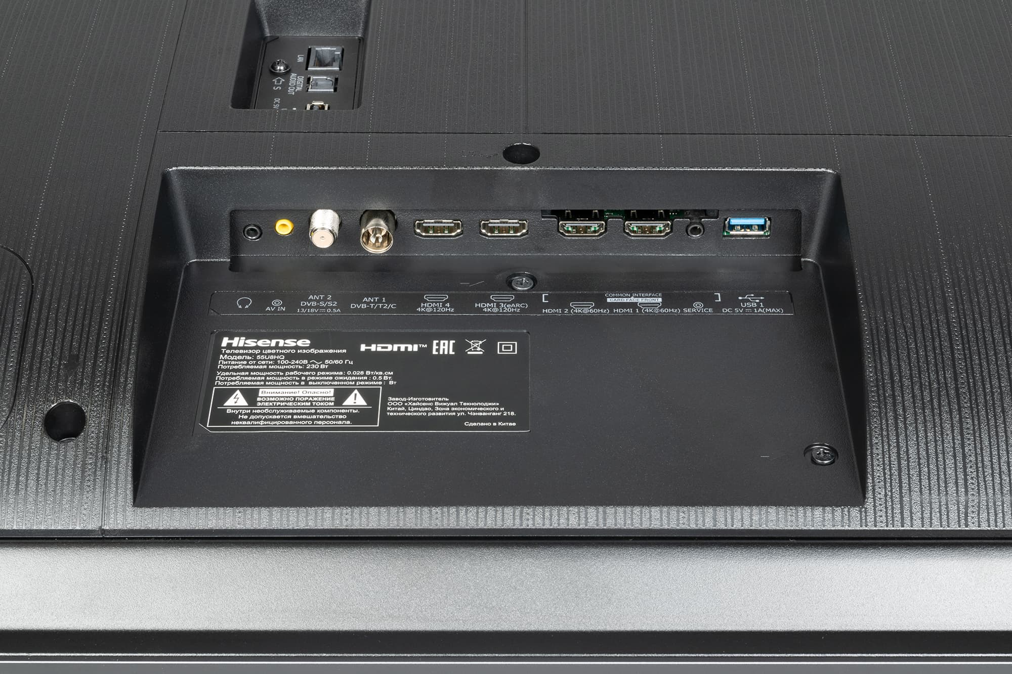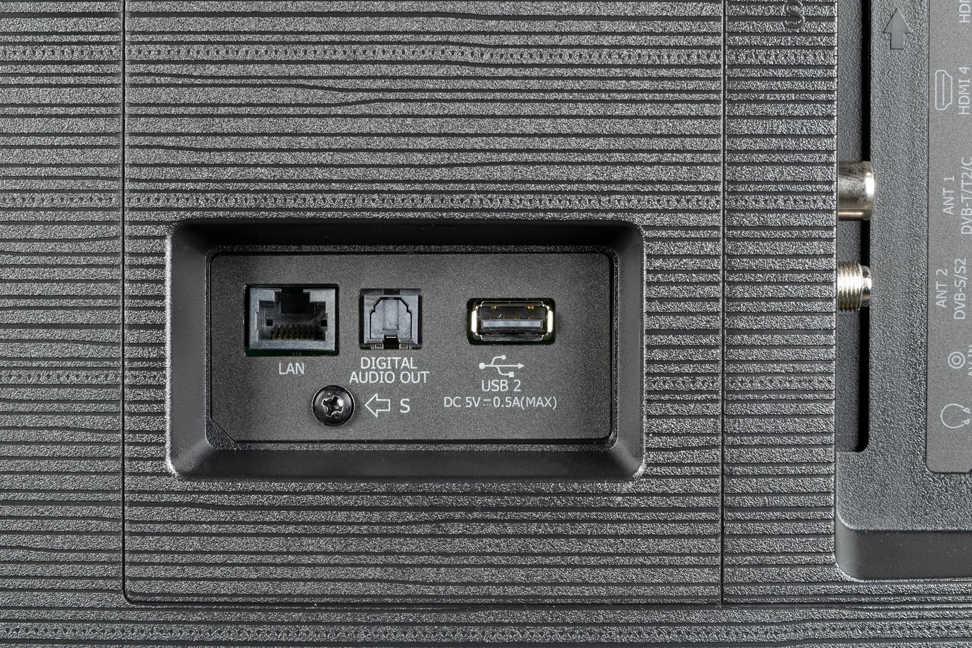 Большинство разъемов стандартные, полноразмерные и размещены более-менее свободно. Исключение — разъем для ввода композитного видеосигнала и стереозвука в аналоговом виде, который представляет собой гнездо для четырехконтактного миниджека. Соответствующего переходника на три RCA в комплекте поставки нет. В плюсы стоит записать целых четыре входа HDMI (HDMI 1 и 2, видимо, версии 2.0, а HDMI 3 и 4 — 2.1) и два USB, один из которых версии 3.0 с максимальным током до 1 А, к этому порту разумно подключать внешний жесткий диск. К другому входу USB можно подключать слаботочную периферию. То, что разъем для подключения к проводной сети находится на плоскости задней панели и ориентирован назад — это не очень хорошо с точки зрения удобства подключения, когда телевизор повешен на стену. Зато проводные наушники подключать относительно удобно.