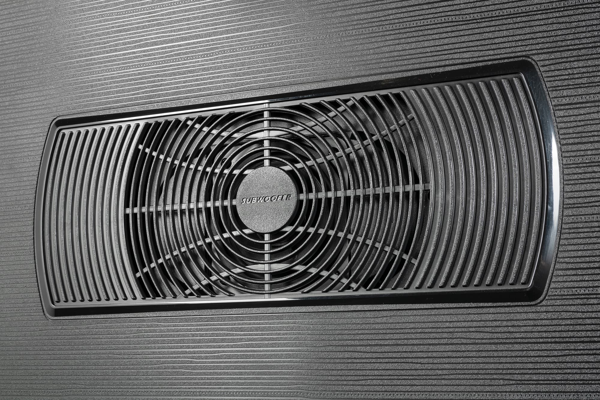 На нижнем и верхнем торцах кожуха и в верхней части есть вентиляционные решетки. Где-то за решетками на нижнем торце должны находится две пары средне-высокочастотных громкоговорителей, а за решеткой на верхнем торце можно обнаружить два высокочастотных громкоговорителя с рупорными излучателями.