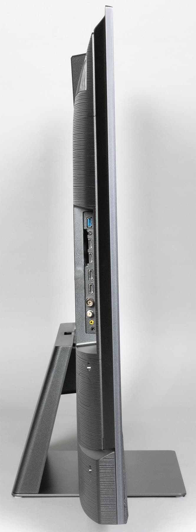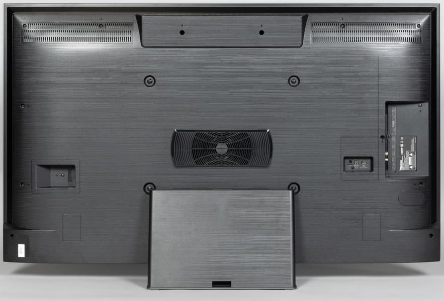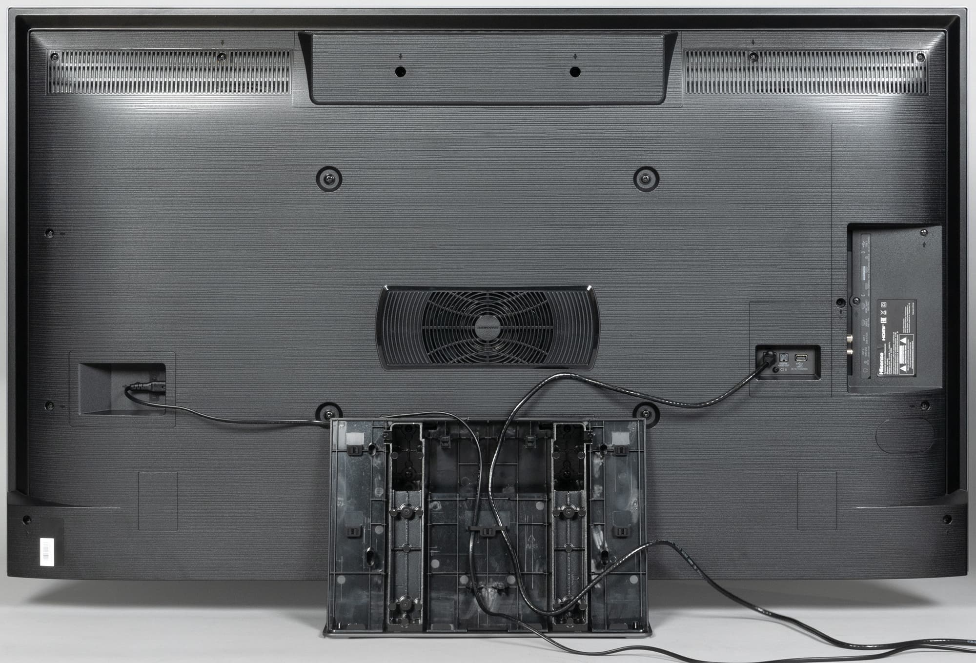 Штатная подставка состоит из двух частей — плоского основания и широкой стойки. Основание изготовлено из толстой стальной пластины и имеет темно-темно-серое слегка серебристое матовое покрытие. Несущая часть стойки изготовлена из алюминиевого сплава. Ее прикрывают кожухи из пластика с черной матовой поверхностью местами с рельефным узором, как на кожухе блока экрана. Задний кожух стойки легко снимается, и за ним можно пропустить кабели, идущие от разъемов телевизора.