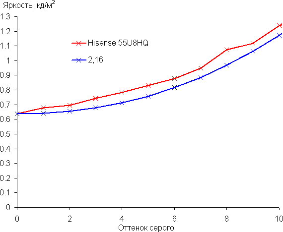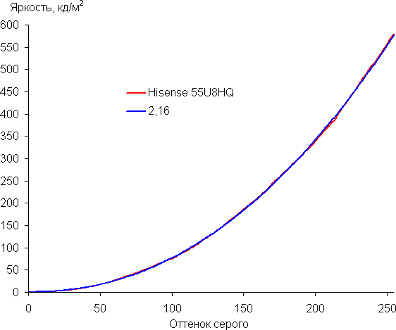 Аппроксимация полученной гамма-кривой дала показатель 2,16, что немного ниже стандартного значения 2,2, при этом реальная гамма-кривая мало отклоняется от аппроксимирующей степенной функции: