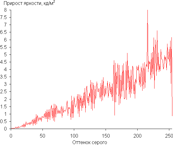 График ниже показывает прирост (не абсолютное значение!) яркости между соседними полутонами: