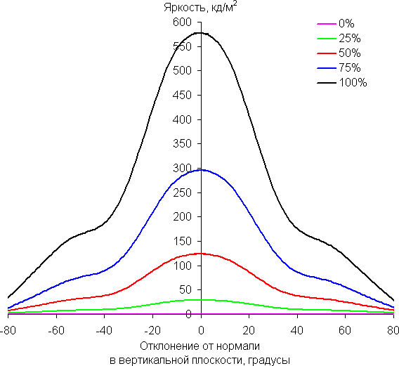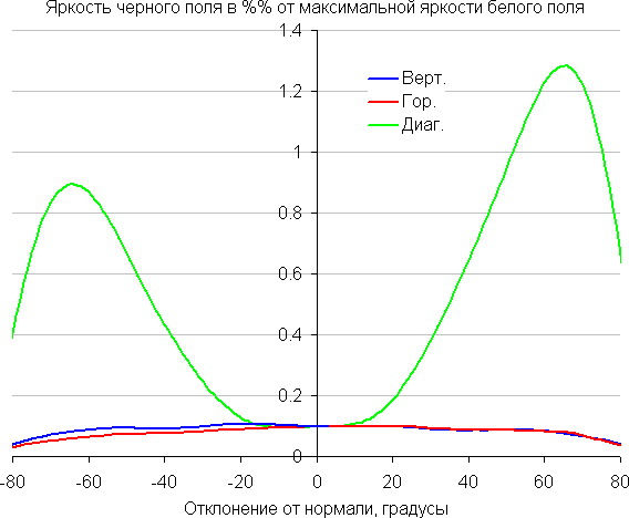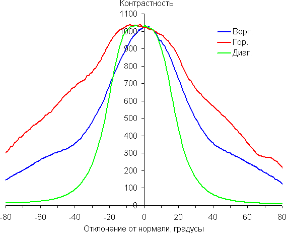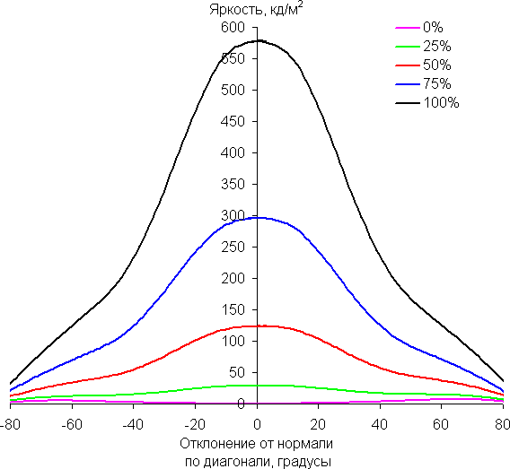 Отметим относительно плавное уменьшение яркости при отклонении от перпендикуляра к экрану во всех трех направлениях в относительно широком диапазоне углов, при этом графики яркости полутонов не пересекаются во всем диапазоне измеряемых углов (то есть нет инвертирования яркости оттенков). По скорости снижения яркости углы обзора хотя бы в горизонтальном направлении относительно широкие, что для матрицы типа IPS характерно. При отклонении в диагональном направлении яркость черного поля начинает резко возрастать уже при 20°-30° отклонения от перпендикуляра к экрану. Если сидеть недалеко от экрана, то черное поле по углам могло бы быть заметно светлее, чем в центре, но обычно этого нельзя увидеть, так как черные поля локально затемняются. Контрастность в диапазоне углов ±82° в случае отклонения по диагонали приближается к отметке 10:1 и по одной диагонали опускается за отметку 10:1 при 78°.
