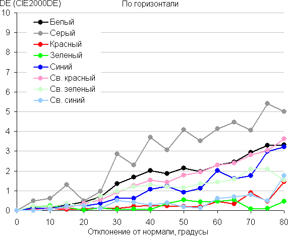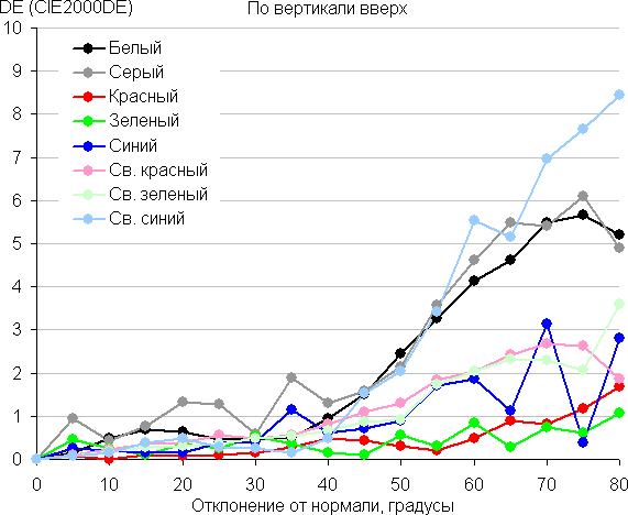 Для количественной характеристики изменения цветопередачи мы провели колориметрические измерения для белого, серого (127, 127, 127), красного, зеленого и синего, а также светло-красного, светло-зеленого и светло-синего полей во весь экран с использованием установки, подобной той, что применялась в предыдущем тесте. Измерения проводились в диапазоне углов от 0° (датчик направлен перпендикулярно к экрану) до 80° с шагом в 5°. Полученные значения интенсивностей были пересчитаны в отклонение ΔE относительно замера каждого поля при перпендикулярном положении датчика относительно экрана. Результаты представлены ниже: