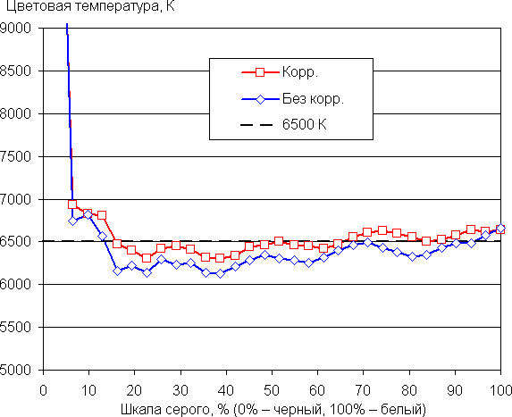 Графики ниже показывают цветовую температуру на различных участках шкалы серого и отклонение от спектра абсолютно черного тела (параметр ΔE) для варианта Теплый1 настройки Цветовая температура (это лучший профиль по характеристикам цветового и яркостного баланса) и после коррекции цветового баланса регулировками усиления трех основных цветов (−5, 0 и −5 для значений усиления красного, зеленого и синего цветов):