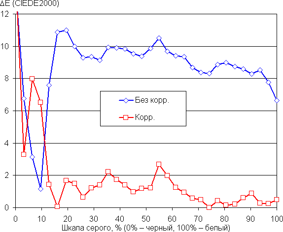 Самый близкий к черному диапазон можно не учитывать, так как в нем цветопередача не так важна, а погрешность измерения цветовых характеристик высокая. Коррекции привела к тому, что ΔE существенно уменьшилась. Впрочем, с потребительской точки зрения баланс хороший и до коррекции, поэтому выполнять ее особого смысла нет.