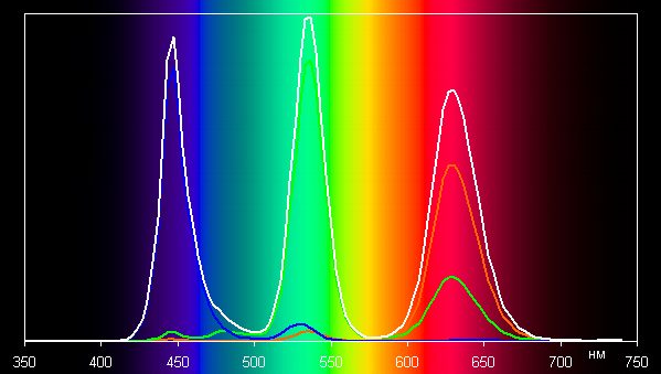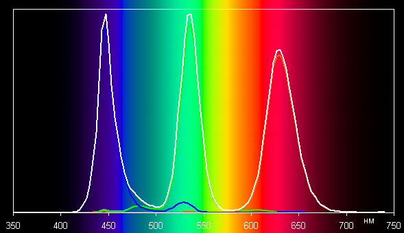 Видно, что спектры компонент хорошо разделены, что и позволяет получить относительно широкий цветовой охват. Перекрестное подмешивание незначительное (возможно, оно обусловлено шириной пропускания светофильтров, а не программной коррекцией), то есть цветовой охват в случае профиля Нативный близок к оригинальному охвату экрана ТВ. Узкие пики первичных цветов не противоречат заявлению производителя о том, что в подсветке используются квантовые точки.