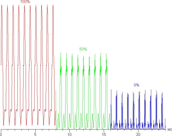 Управление яркостью свечения каждого из светодиодов (или групп из нескольких светодиодов) подсветки осуществляется с помощью ШИМ с частотой 1,2 кГц. Ниже приведена зависимость яркости от времени, числа — это значения настройки Подсветка экрана: