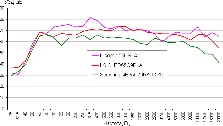 Сравним АЧХ этого ТВ с АЧХ двух других телевизоров (АЧХ получена с помощью шумомера при воспроизведении звукового файла с розовым шумом, замер УЗД в интервалах по 1/3 октав):