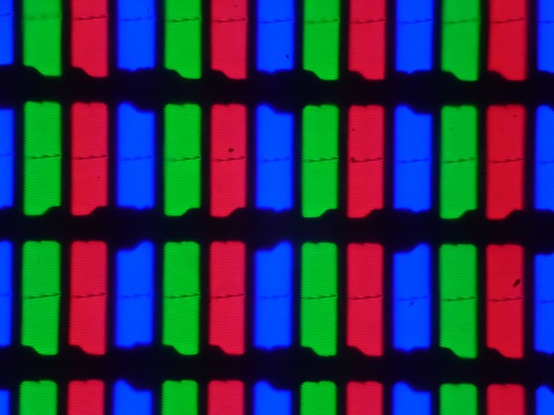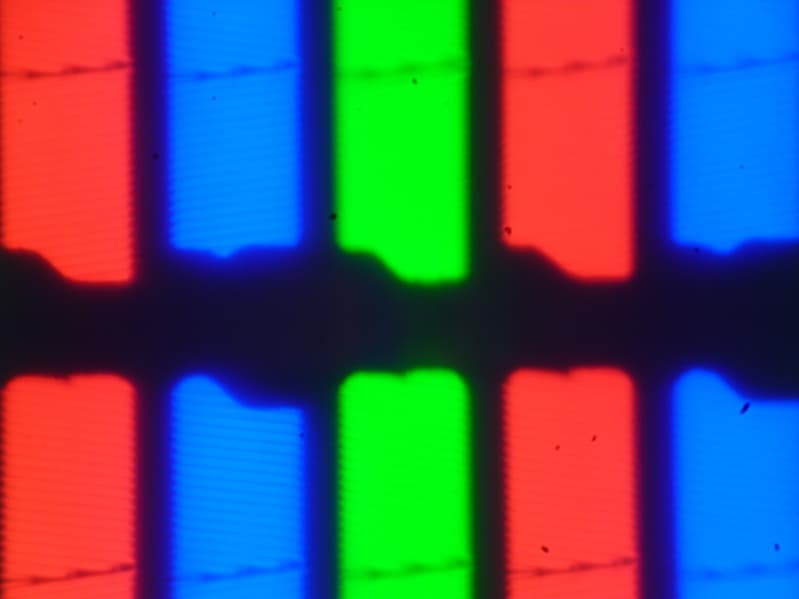 Из-за слегка матовой поверхности экрана четкого изображения пикселей получить не удалось (черные точки — это пыль на матрице фотоаппарата), однако характерная для IPS структура субпикселей видна: