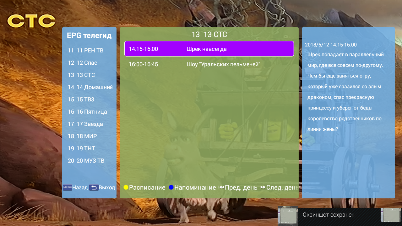 Есть поддержка электронной программы передач — можно посмотреть, что именно идет на текущем и других каналах и запрограммировать просмотр выбранной передачи.