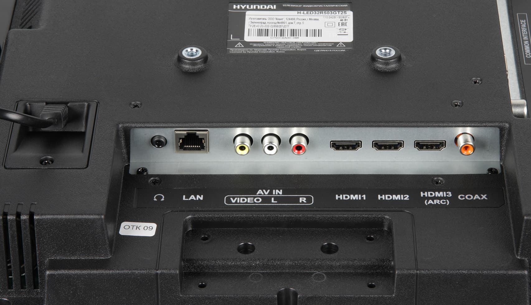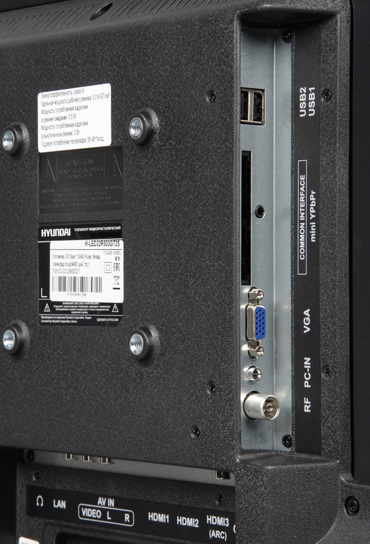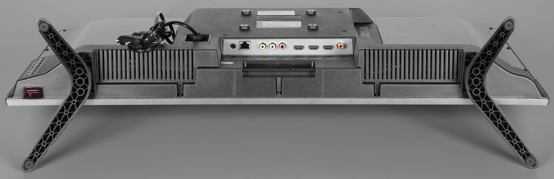 Разъемы размещены в двух нишах на задней панели. Часть разъемов направлена вниз, часть вбок, назад ничего не торчит, что хорошо. Спереди дотягиваться до разъемов, например, до разъема для наушников непросто. На помощь могут прийти кабели-удлинители. Кабель питания неотсоединяемый. Таблица с характеристиками в начале статьи дает представление о коммуникационных возможностях телевизора. Большинство разъемов стандартные, полноразмерные и размещены более-менее свободно. Претензии можно предъявить к тесно расположенным входам USB и к непривычному компонентному видеовходу в виде разъема миниджек 3,5 мм на 4 контакта.