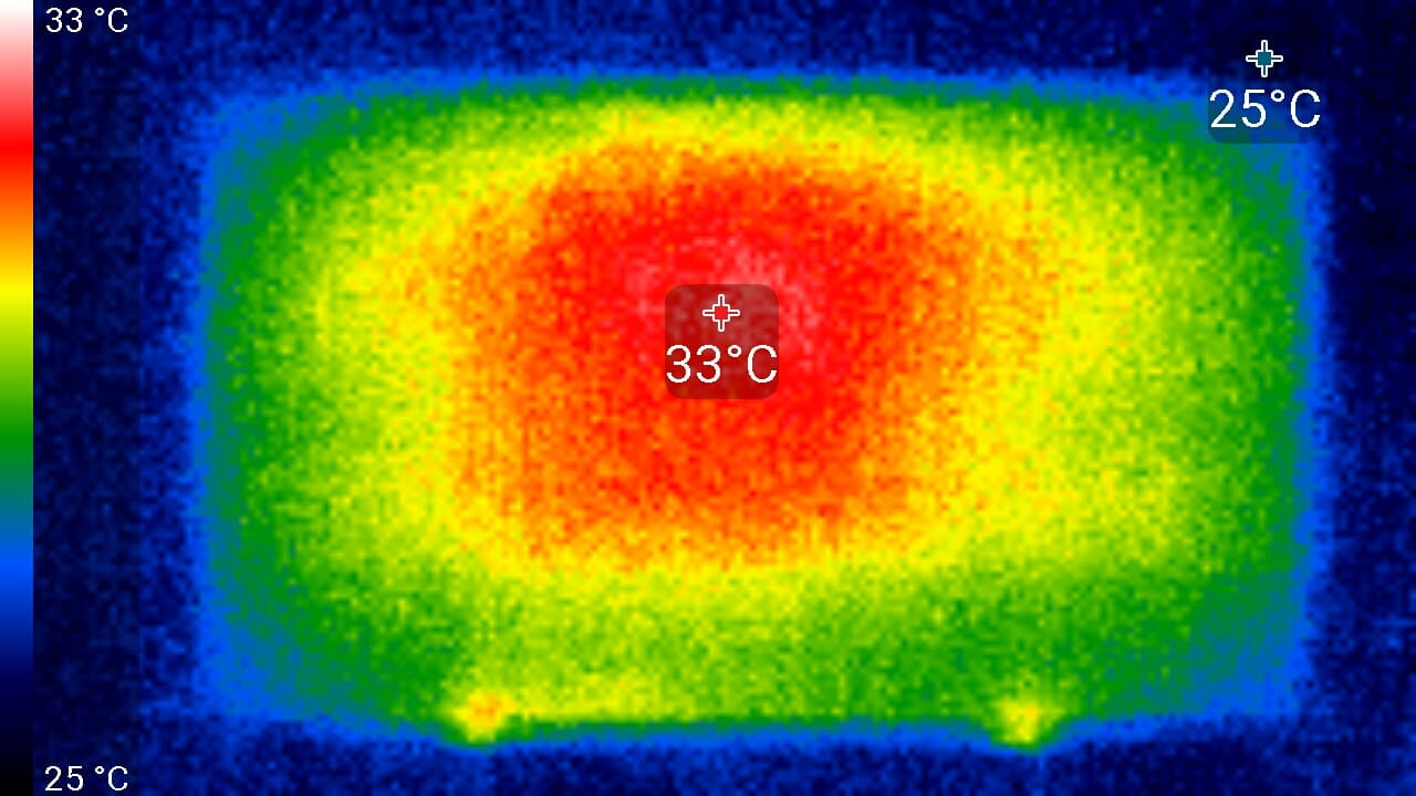 Снимок сзади показывает возможное расположение светодиодных линеек подсветки — две горизонтальные полосы с повышенной температурой.