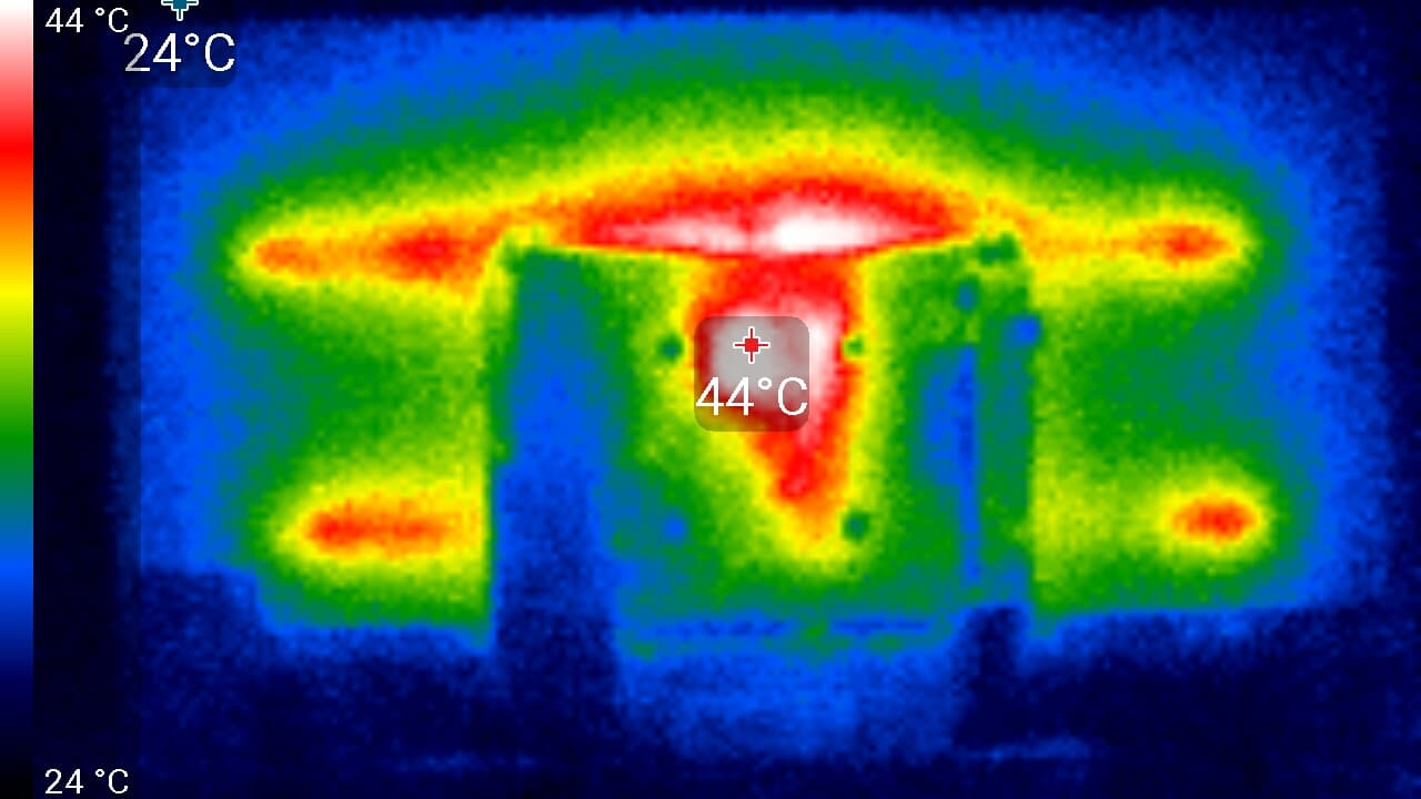 Нагрев телевизора можно оценить по приведенному снимку с ИК-камеры, полученному после долговременной работы на максимальной яркости в помещении с температурой примерно 24 °C: