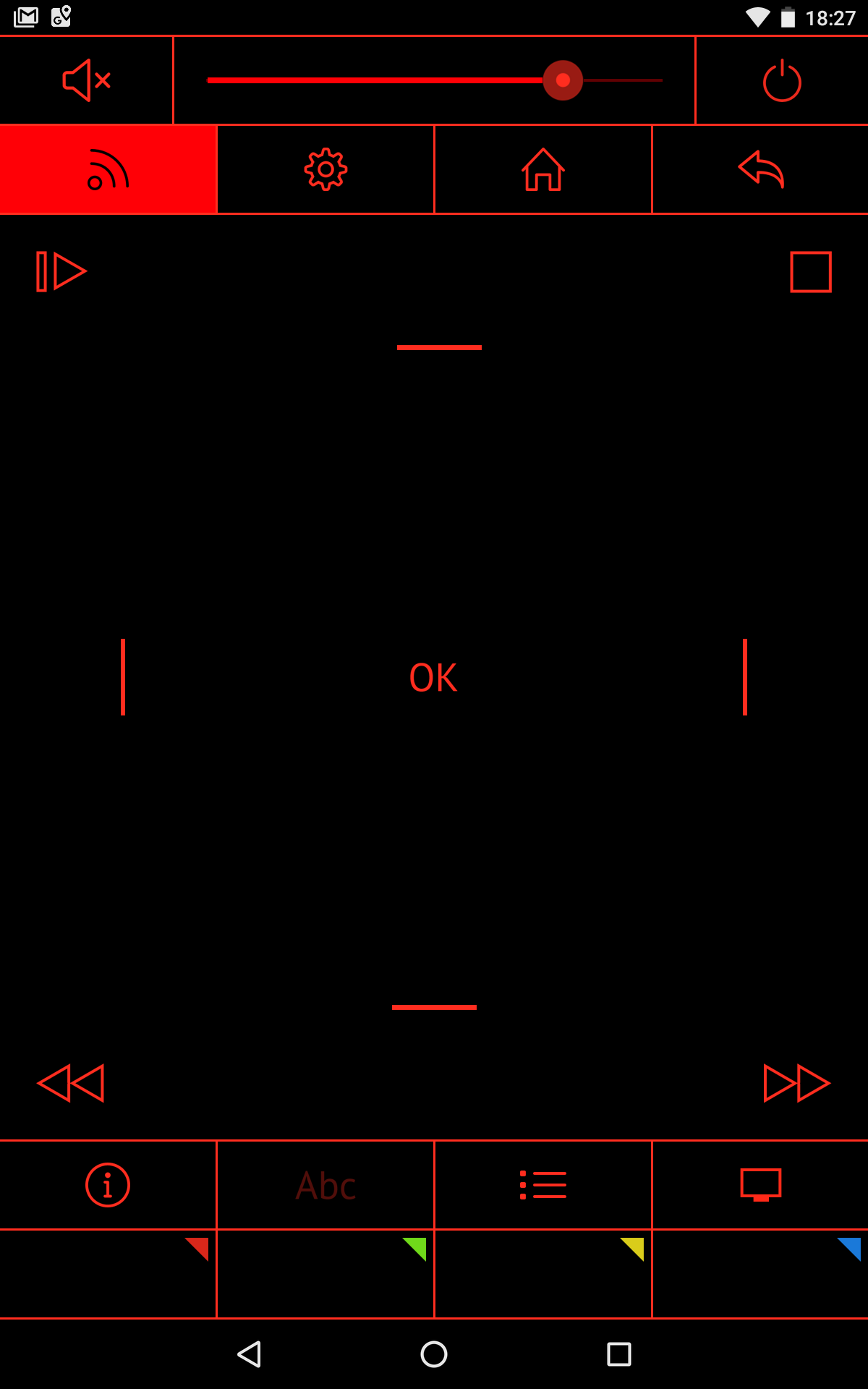 Для ее функционирования необходимо, чтобы ТВ и мобильное устройство находились в одной сети. В окне программы есть ползунок громкости и несколько виртуальных кнопок. К сожалению, текстовый ввод с экранной клавиатуры мобильного устройства задействовать нам не удалось.