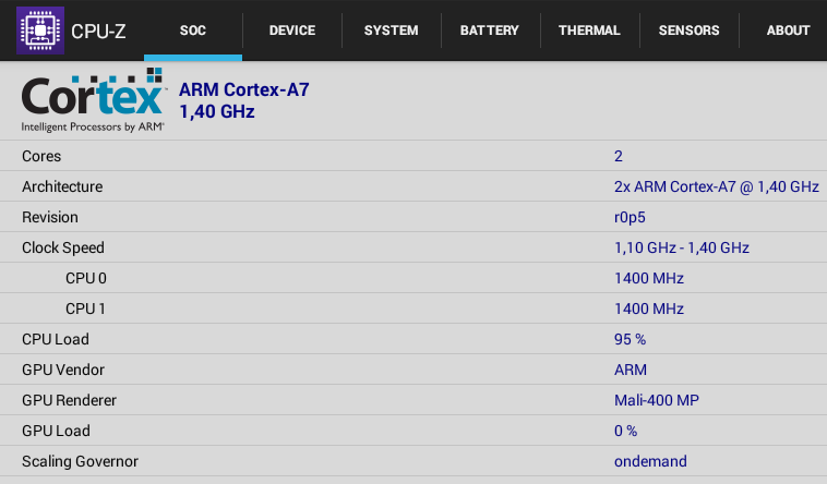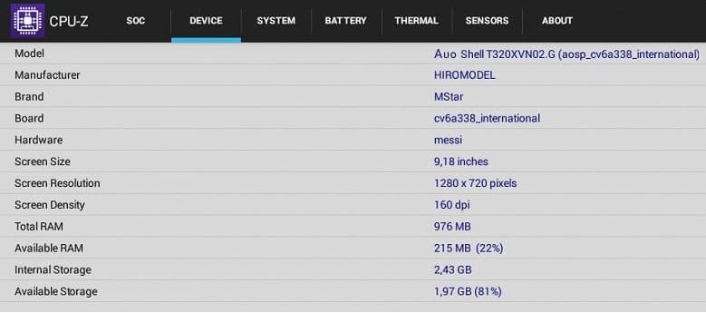 Встроенные приложения для воспроизведения мультимедийного контента не могут похвастаться особой функциональностью, но это не является существенным недостатком, так как подходящее приложение можно уставить из Google Play (или из файлов APK, но это мы не проверяли). По этой причине не было особого смысла тестировать воспроизведение аудио- и графических файлов. Проверка поддержки аппаратного декодирования видеопотоков сохранила актуальность, так как система, на которой основан телевизор, не имеет достаточной производительности для программного декодирования файлов высокого разрешения. Аппаратную конфигурацию подтверждает программа CPU-Z: