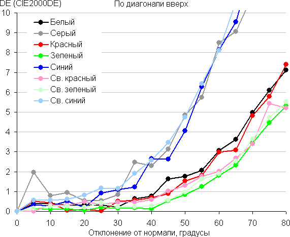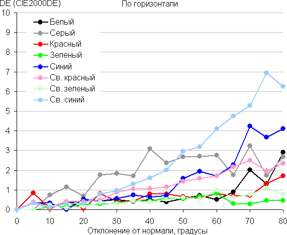 Для количественной характеристики изменения цветопередачи мы провели колориметрические измерения для белого, серого (127, 127, 127), красного, зеленого и синего, а также светло-красного, светло-зеленого и светло-синего полей во весь экран с использованием установки, подобной той, что применялась в предыдущем тесте. Измерения проводились в диапазоне углов от 0° (датчик направлен перпендикулярно к экрану) до 80° с шагом в 5°. Полученные значения интенсивностей были пересчитаны в отклонение ΔE относительно замера каждого поля при перпендикулярном положении датчика относительно экрана. Результаты представлены ниже: