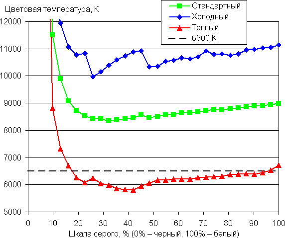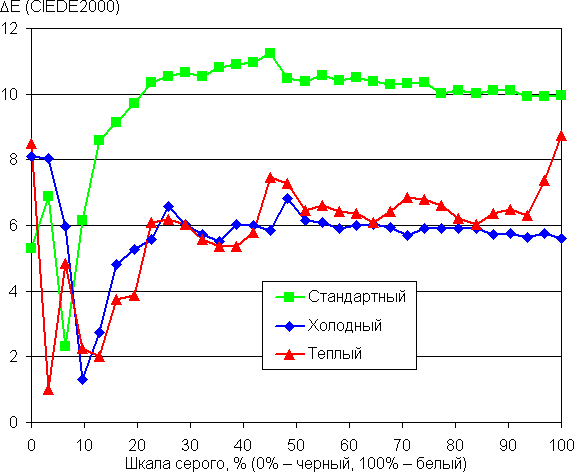 Графики ниже показывают цветовую температуру на различных участках шкалы серого и отклонение от спектра абсолютно черного тела (параметр ΔE) для трех встроенных профилей цветовой температуры:
