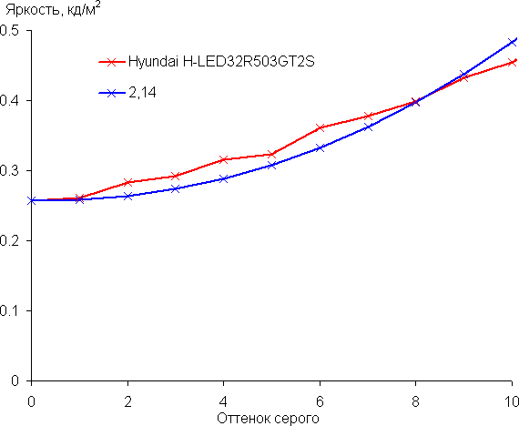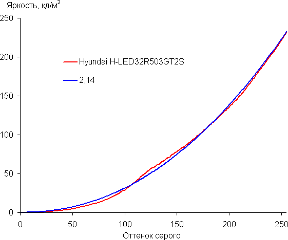 Аппроксимация полученной гамма-кривой дала показатель 2,14, что немного ниже стандартного значения 2,2, при этом реальная гамма-кривая заметно отклоняется от аппроксимирующей степенной функции: