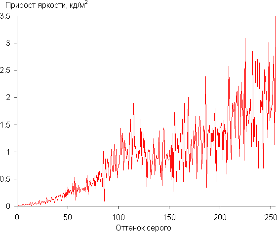 Для оценки характера роста яркости мы измерили яркость 256 оттенков серого (от 0, 0, 0 до 255, 255, 255) при подключении к ПК по HDMI в режиме RGB. График ниже показывает прирост (не абсолютное значение!) яркости между соседними полутонами: