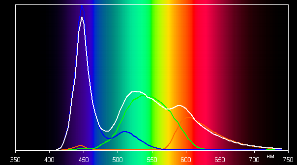 Ниже приведен спектр для белого поля (белая линия), наложенный на спектры красного, зеленого и синего полей (линии соответствующих цветов):
