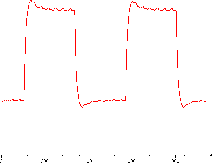 Время отклика при переходе черный-белый-черный равно 21,3 мс (11,7 мс вкл. + 9,6 мс выкл.). Переходы между полутонами происходят в среднем за 26,1 мс в сумме. Есть слабый «разгон» матрицы, не приводящий к видимым артефактам, — на фронтах включения и выключения видны небольшие выбросы.