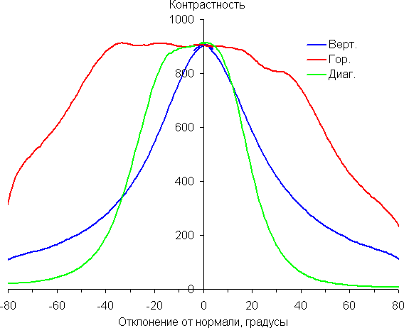 Отметим плавное уменьшение яркости при отклонении от перпендикуляра к экрану во всех трех направлениях, при этом графики яркости полутонов не пересекаются во всем диапазоне измеряемых углов. По степени снижения яркости телевизор имеет очень хорошие углы обзора. При отклонении в диагональном направлении поведение яркости оттенков имеет промежуточный характер между вертикальным и горизонтальным направлениями, за исключением яркости черного поля, которая начинает резко возрастать уже при 20° отклонения от перпендикуляра к экрану. Если сидеть от экрана на расстоянии 60-70 см, то черное поле по углам будет заметно светлее, чем в центре. Контрастность в диапазоне углов ±82° для двух направлений значительно превышает 10:1 и только для диагонального направления она ниже и по одной диагонали опускается за отметку 10:1 при 68°.