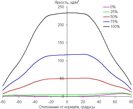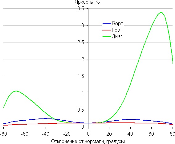 Чтобы выяснить, как меняется яркость экрана при отклонении от перпендикуляра к экрану, мы провели серию измерений яркости белого в центре экрана в широком диапазоне углов, отклоняя ось датчика в вертикальном, горизонтальном и диагональном (из угла в угол) направлениях.