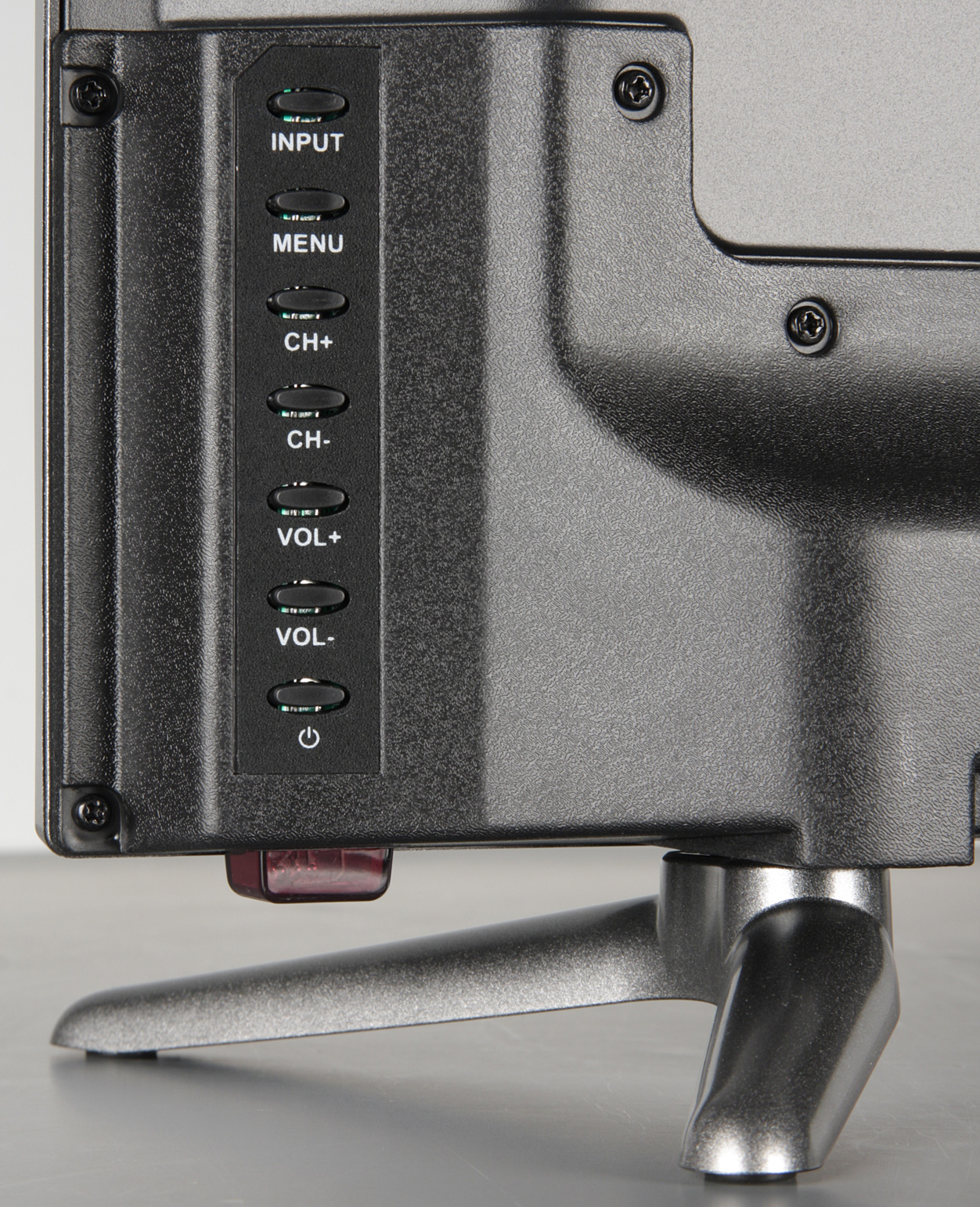 На нижнем торце справа есть накладка из прозрачного тонированного красным пластика. Она прикрывает ИК-приемник пульта ДУ и индикатор состояния. В дежурном режиме индикатор неярко горит красным, а в рабочем — светится зеленым. На задней панели под правую руку находятся семь кнопок, с помощью которых можно очень ограниченно управлять телевизором без помощи пульта ДУ.