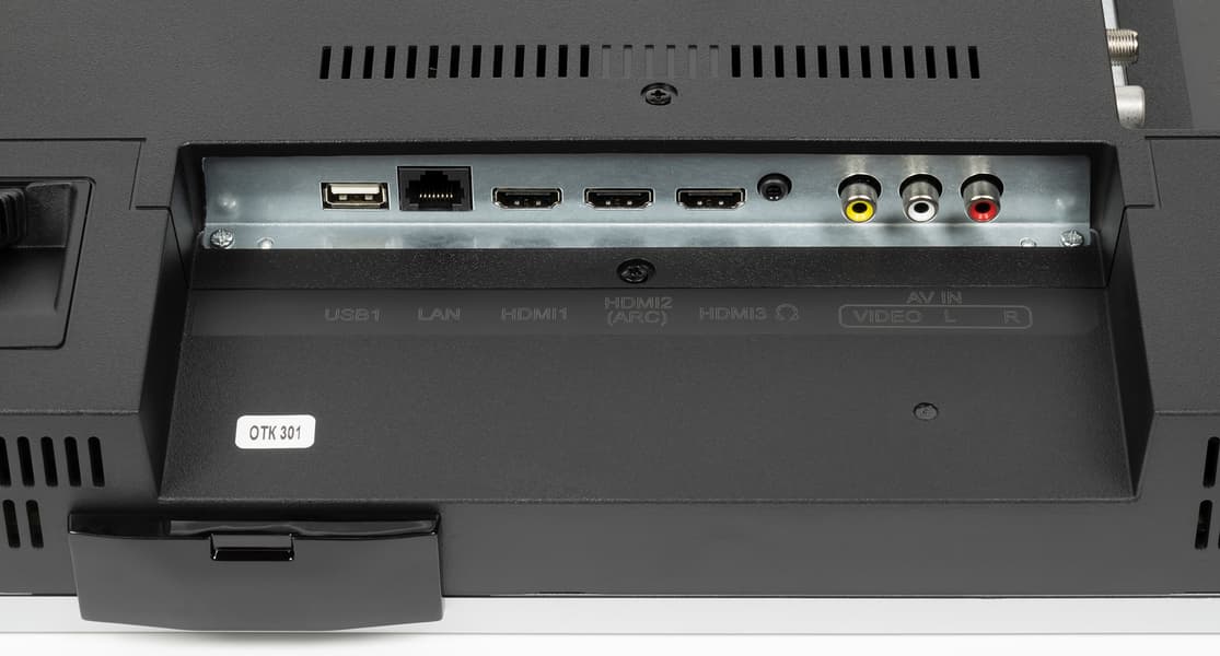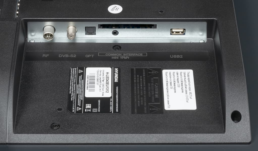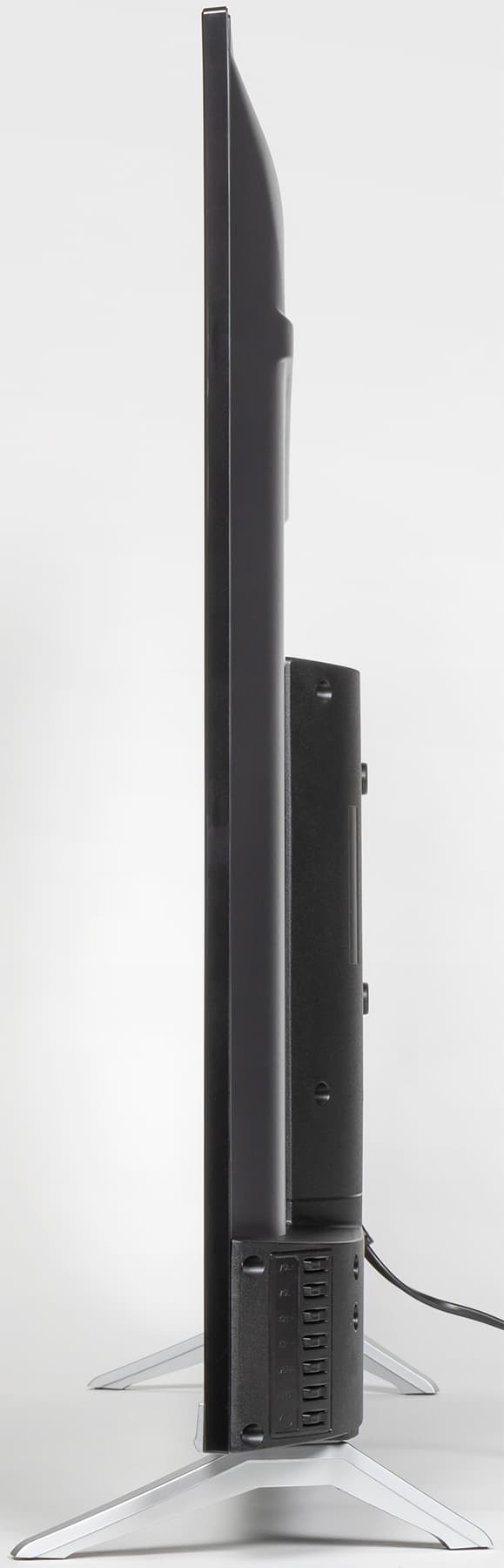 Задняя панель условно в верхней части изготовлена из тонкого листа стали и имеет стойкое черное матовое покрытие. Выступающий назад кожух в нижней части с заходом на нижний торец изготовлен из черного пластика с матовой поверхностью. Интерфейсные разъемы размещены в двух незамкнутых нишах. Часть разъемов направлена вниз, часть вбок. Спереди дотягиваться до разъемов, даже направленных вбок, неудобно. Подключать кабели к разъемам, направленным вниз, еще сложнее. В верхней части телевизор относительно тонкий.
