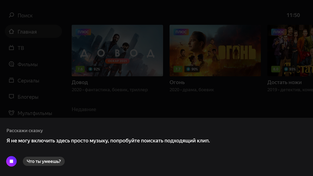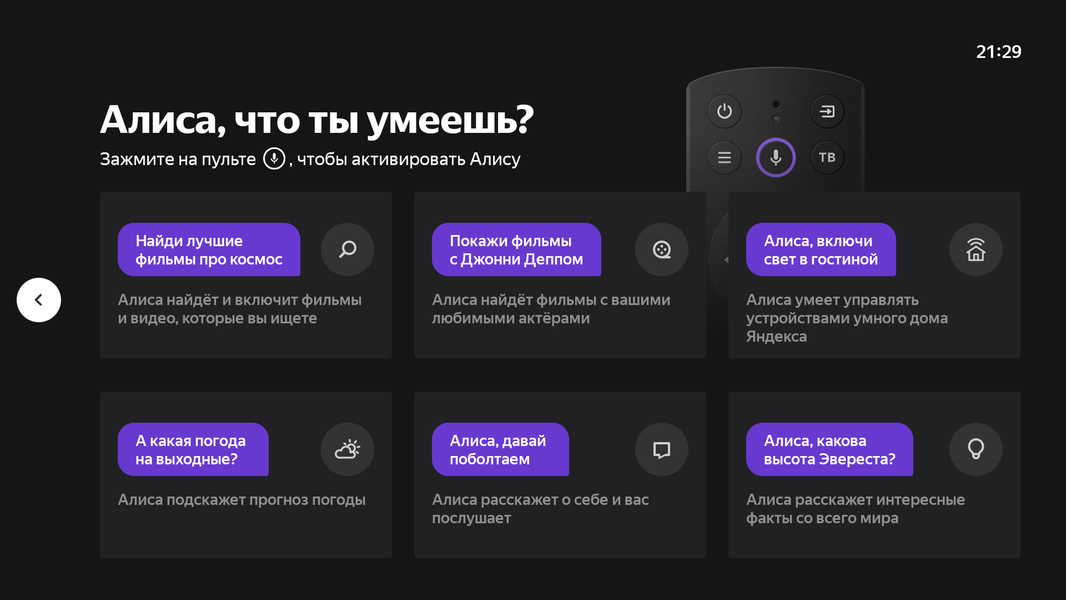 Алиса в этом телевизоре слушает пользователя только тогда, когда он нажал и удерживает кнопку с изображением микрофона на пульте. Другого способа активировать голосового помощника нет. Алису можно попросить найти фильм или сериал по названию, фильмы с определенным актером и т. д.