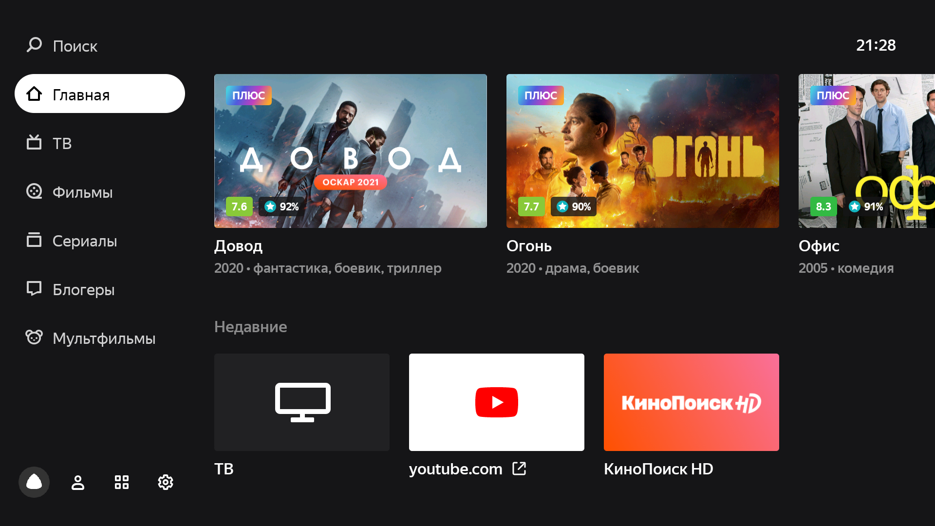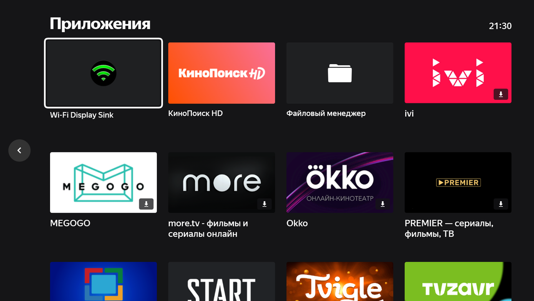Даже приложения YouTube в явном виде нет, есть только ссылка на веб-версию для Smart TV. Магазин приложений также отсутствует. Впрочем, пользователю предлагается список из прямых ссылок, позволяющих установить нескольких популярных приложений. Также приложения, в том числе сторонние магазины, можно установить из файлов APK. Эти файлы, как и, например, фильмы, фотографии и музыку можно записать на USB-носитель, чтобы затем установить или воспроизвести их на телевизоре с помощью уже установленного Файлового менеджера. Впрочем, концепция платформы Яндекс.ТВ предполагает, что пользователь весь необходимый ему контент будет получать непосредственно с домашней страницы телевизора, по необходимости используя Алису в качестве советчика, а потому особой надобности в использовании сторонних приложений нет.