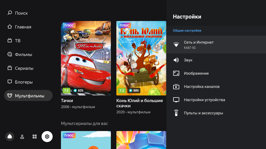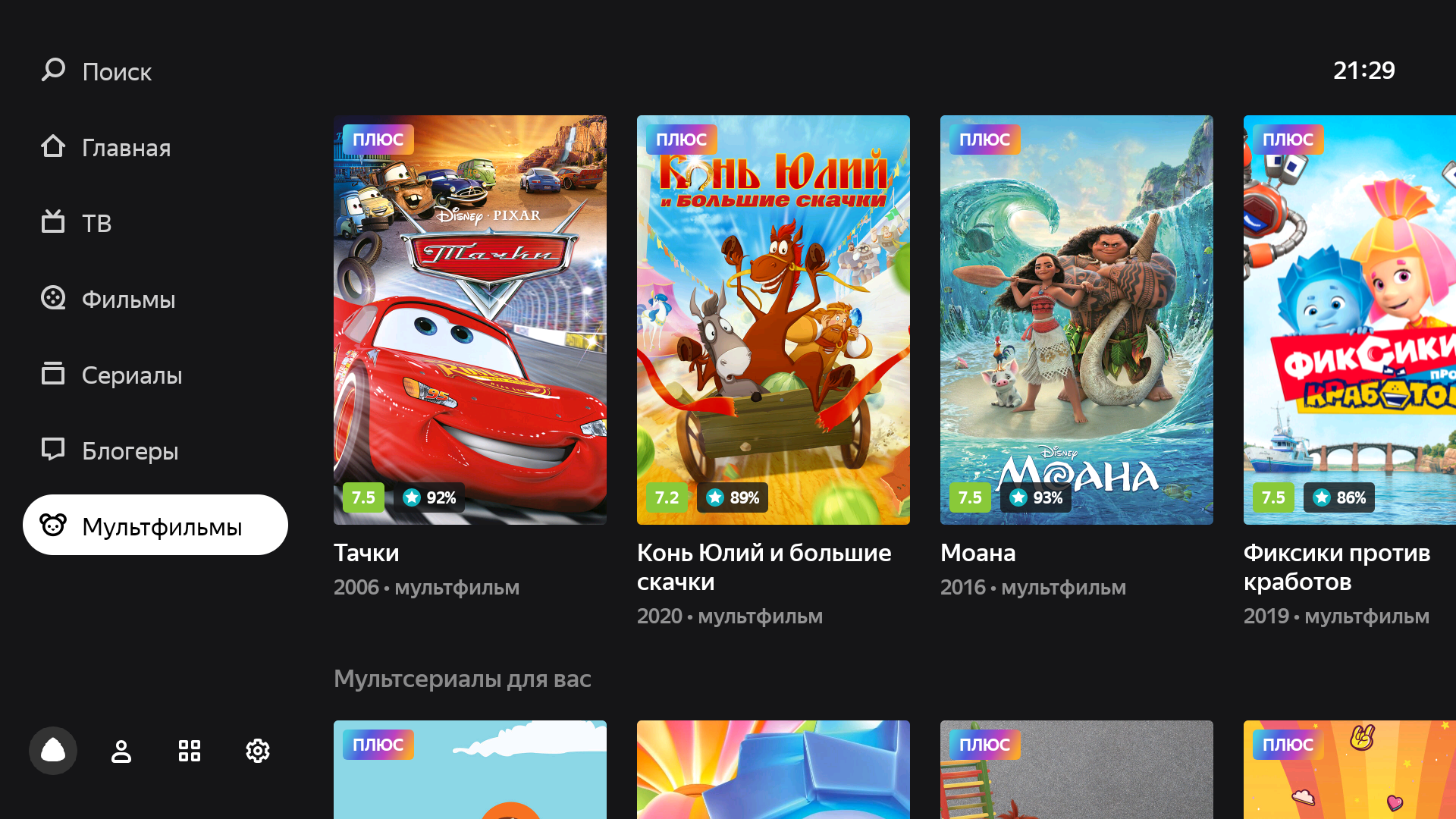 Пункты Фильмы, Сериалы, Блогеры и Мультфильмы позволяют выбрать соответствующий контент дополнительно разбитый на категории.