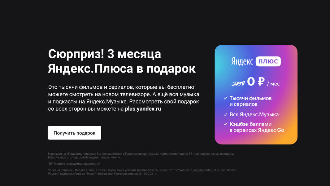 В случае Яндекс.ТВ совсем бесплатный контент есть, но его не очень много, гораздо больше интересного появляется, если зритель оформит хотя бы подписку Яндекс.Плюс. Базовая цена на эту подписку составляет 199 рублей в месяц. Покупателям телевизора с платформой Яндекс.ТВ предоставляется бесплатная возможность оценить преимущества подписки Яндекс.Плюс в течение трех месяцев.